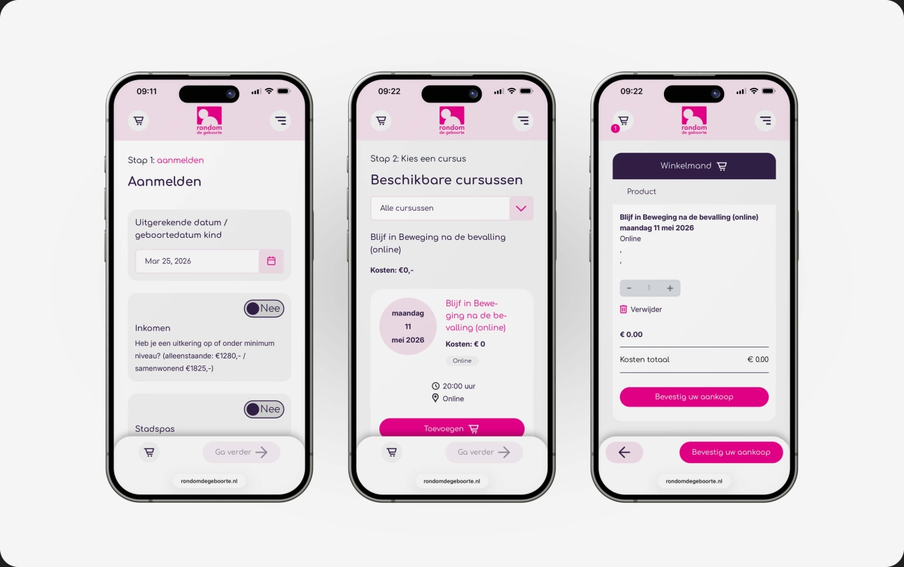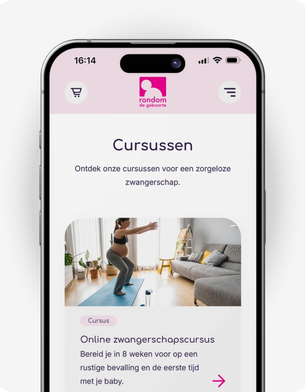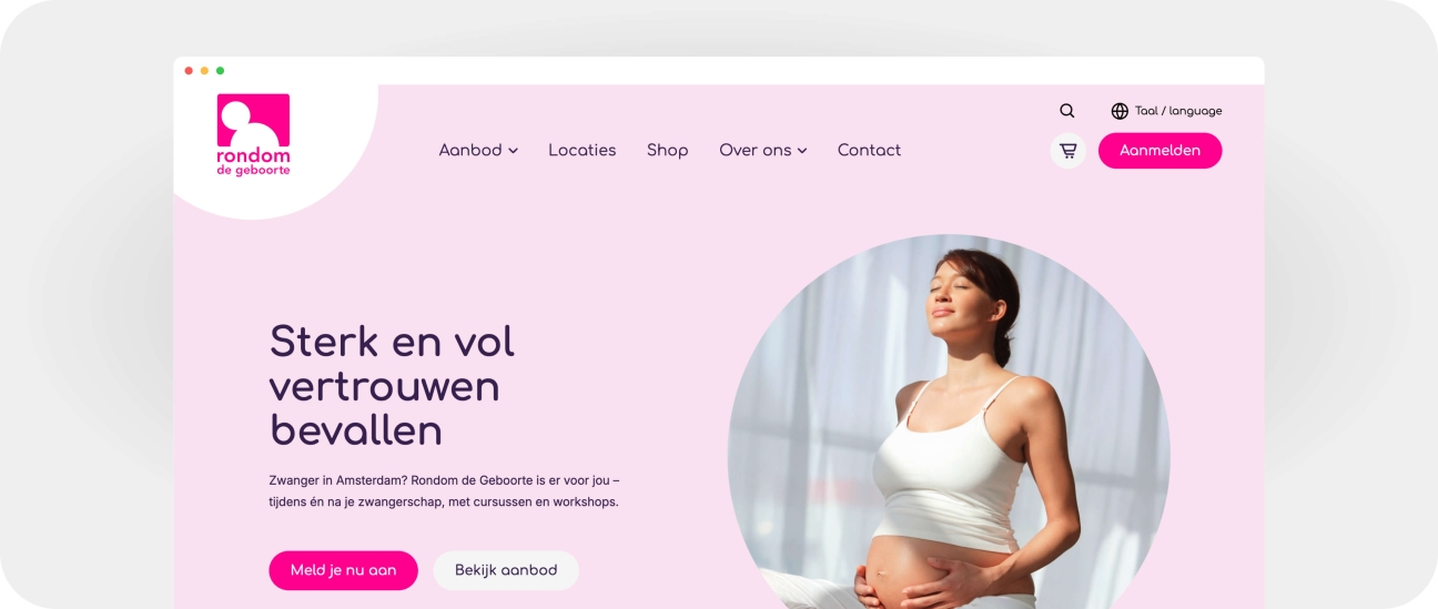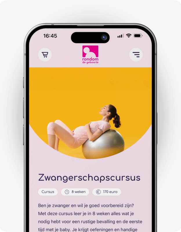 We developed a new design that combines warmth, trust, and the identity of Rondom de Geboorte. The visual style appeals to the target group and brings the theme of birth to life in an accessible and contemporary way. We also optimized the registration process. By including the due date in the user flow, among other things, we help visitors find a course that suits their stage and needs more quickly. We also created two separate links to the course administration, which has significantly streamlined internal processes for employees.